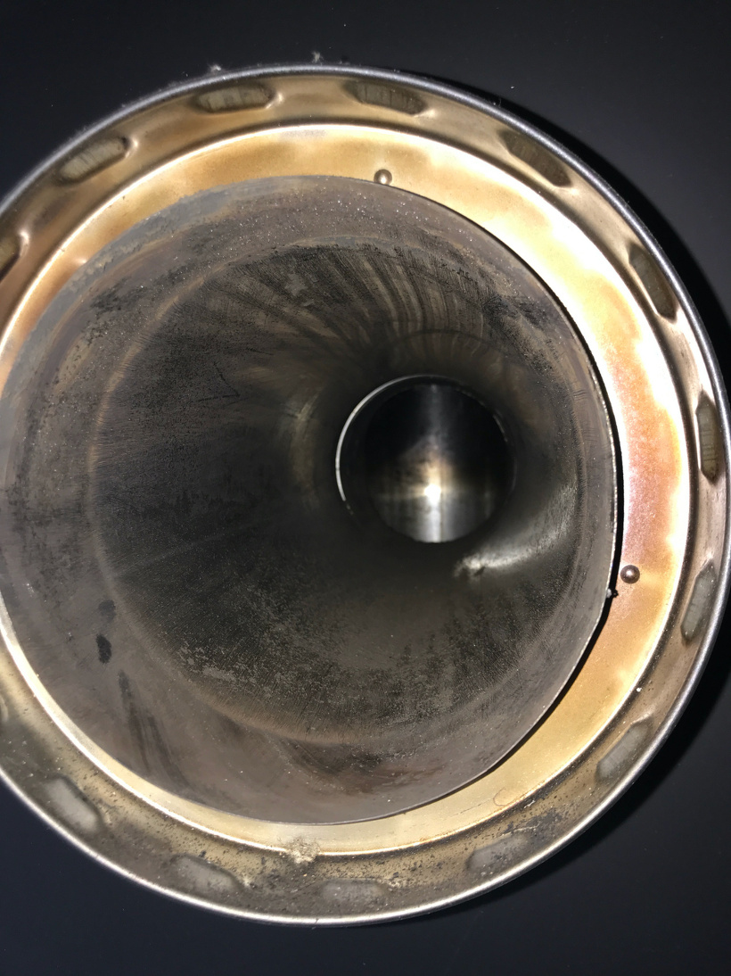 この写真はストーブのすぐ上部から壁出しにしている箇所の横引き部煙突内部です。煤がたくさん付着していますが、このススはパウダー状の綺麗な煤です。なぜこの様な煤がたくさん付着しているかというと、温度の上昇が緩やかだった事が原因です。このススは低温(250℃〜600℃)でも燃えた時にできるのですが、薪が熱分解した時可燃性のガスの他に煤も発生します。その煤が燃えずに煙突から排出される途中で煙突内部に付着します。このススはクレオソートと呼ばれる危険なススとは異なります。クレオソートと呼ばれるススは、可燃性のガスが燃やされずに煙突から排出される時次第に冷やされてしまうことによって煙突内部に結露して付着します。従って煙突トップに近いところから付着しがちです。燃焼温度が極めて低いときは煙突の下部に付着することもあります。可燃性のガスは250℃ほどで燃え始め、熱分解時の煤は600℃から燃えますので、250℃〜600℃の間はこの綺麗なスス(ソート)は必ず発生します。従って温度上昇が緩やかだったと結論づける事ができます。巷では温度はゆっくりあげたほうがいいと言われていますが、早く温度を上げたほうがこの様な煤の発生を抑える事ができます。煙突トップからこの煤が近隣に飛散するリスクも軽減できます。特に住宅街で使用されている方は温度はできるかぎる速やかにあげる様にすれば煤の飛散を抑え近隣お方たちに不愉快な思いをさせずに済むのでは無いかと思います。