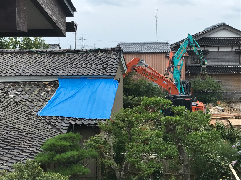 今回の地震で隣人宅は不幸にも全壊で取り壊し工事が行われていました。このお客様宅も建具が途中までしか閉まらなかったり、100年守り抜いた蔵は大きな被害に見舞われ立入できなくなってしまっています。