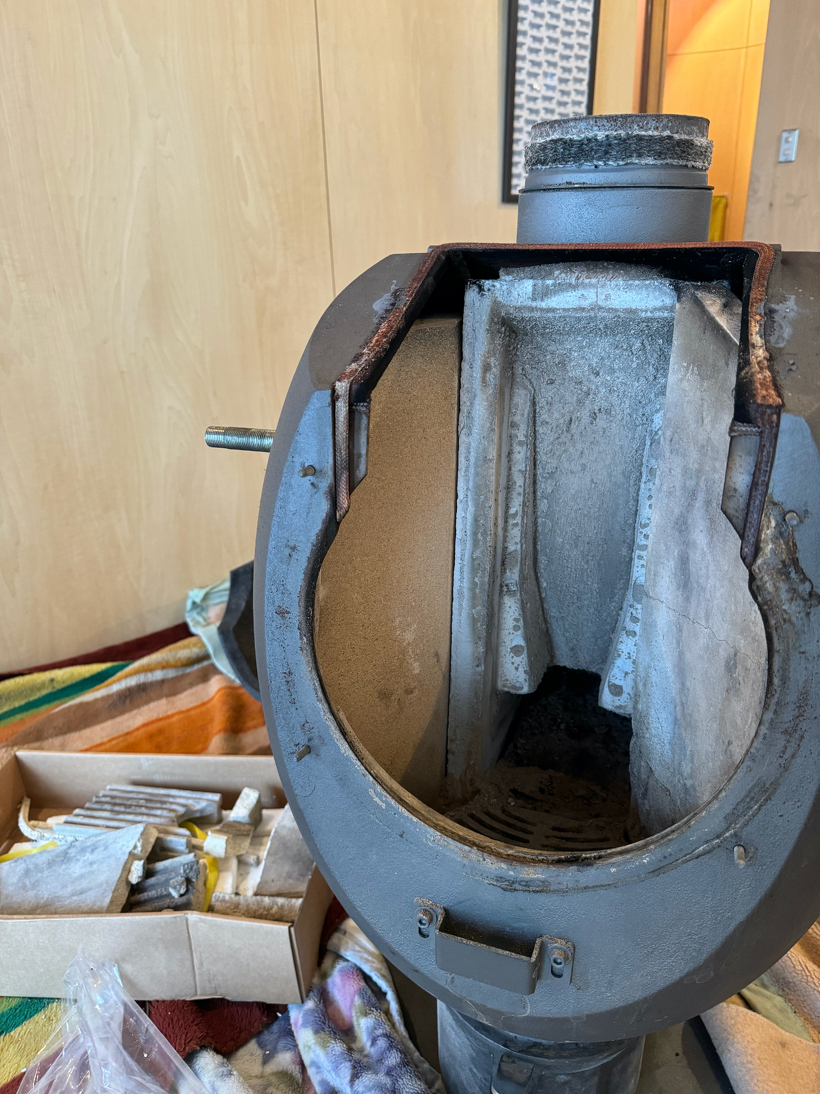 新品同様に修理させて頂きました 2024.05.19 耐火煉瓦を外したところ。この後煙突カラーを外し傷んでいたガスケットの交換をさせて頂きました。 長年使われたきたT-EYEの大掛かりな修理をさせて頂きました。通常のメンテナンスではあまり外さない煙突カラー、ローディングドアを外し、破損しているガスケットの交換をさせて頂きました。燃焼室耐火煉瓦は現場で少し加工をしてぴったり収める事ができました。一点一点手作りストーブのため多少の個体差があり微調整が必要でした。塗装もし直し新品同様になりました。これでまた長く安心安全にご使用していただける様になりました。 全ての破損箇所のパーツを交換して新品同様になったT-EYE。