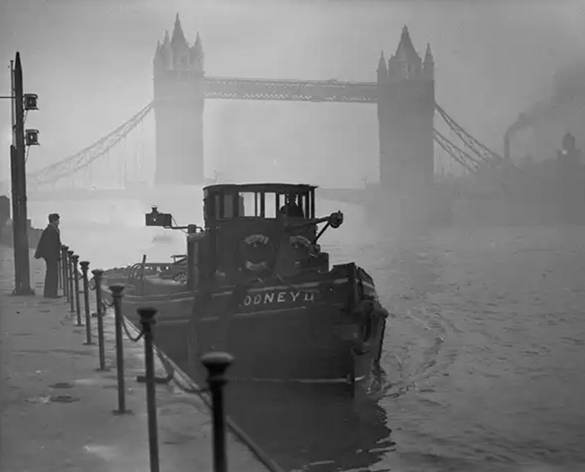 1950年代のロンドンで薪ストーブや暖炉によって発生したスモッグ。マスク無しでは外出できない環境下になってしまっています。
