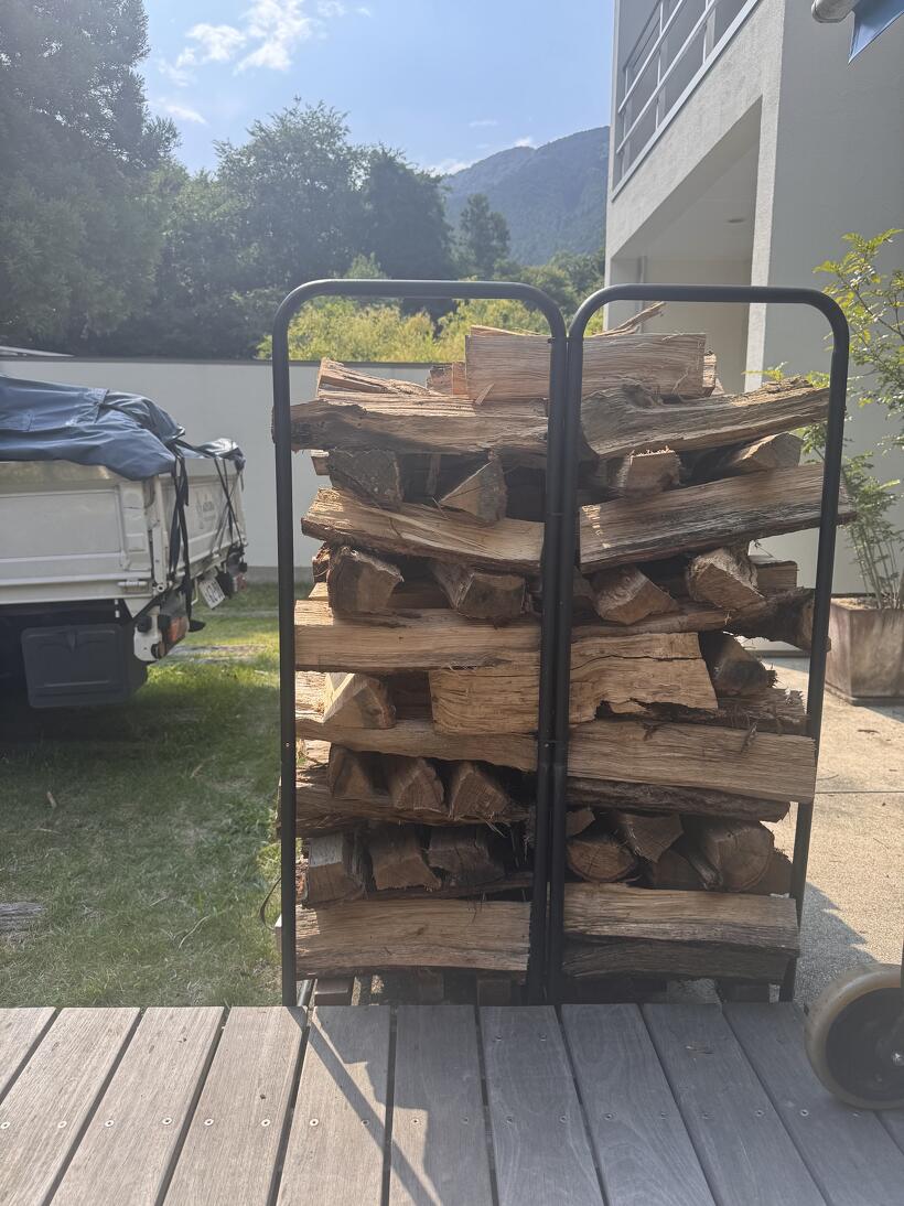 薪の積み方 2025.08.25 来シーズン用の薪を納品させて頂いた時の写真ですが、手前の薪が右に傾いているのがわかるでしょうか?この部分は昨シーズン余った薪をお客様が移設した薪棚に積み上げていました。一列に積み上げると薪が乾燥していくにつれ傾いたり崩れたりしてしまうことがあります。 こちらの写真の方が傾き加減がよく分かるのではないでしょうか?このままではシーズンまでには多分崩れてしまいますので積み直す必要があります。 こちらの写真が積み直した薪棚の様子です。まっすぐ積み直したことがわかると思います。しかしただ積み直しただけでは再び崩れてしまうので、ちょっとした積み方の工夫が必要です。 こちらが1年分の薪を全て積んだ写真です。量は約2.25ステール。この積み方を詳しく知りたい方はこちらのYouTube(絶対に崩れない薪の積み方)を参考にして頂けると嬉しいです。https://www.youtube.com/watch?v=4EPXqylBj7A&t=35s