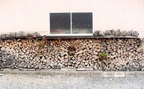 こちらは私のお客様ではないのですがいるところで見かけた薪の積み方としては悪い例です。中央には装飾的な積み方もされており一見すると綺麗に積まれていますが。この積み方はあまり良くありません。理由は一番下の薪が地面に直接置かれているため風が抜けず乾燥が悪くなります。薪を積み上げる場合一番下は地面から30㎝以上は開けないと風が通らずカビが生えたり腐ってしまう事があります。