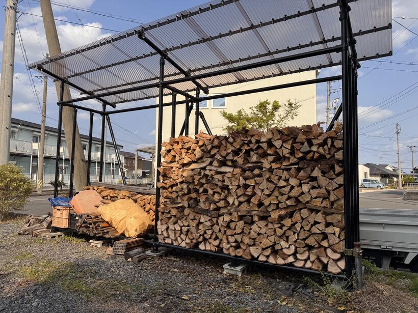 こちらは私のお客様の薪棚で、単管でお客様のDIYで作られた薪棚。薪ストーブは薪の良し悪しで暖かさや快適さが全く違ってきます。また乾燥の悪い薪を燃やすとPMや多環芳香族炭化水素といった強い発がん性物質が放出され、環境を汚染してしまいます。冬に向けて薪の準備をされている方も多いかと思いますが、薪全体に風が通り抜けるような薪棚を作ることはとても大切で、薪棚を作る手間を惜しまず適切な薪棚に薪を積み上げる様にしてください。