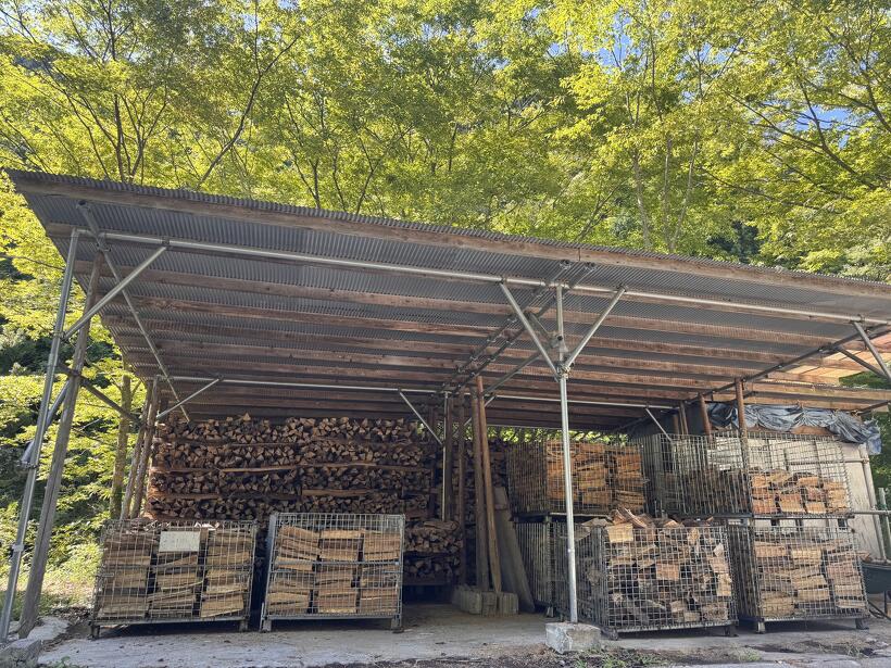 こちらは青い空で作っている薪置き場です。メッシュボックスに入れてある33㎝にカットした薪と。1mの長さで割った薪を下から30㎝程浮かして積み上げている薪です。この場所はすぐ裏には谷になっていていつも谷風が吹いていて薪を乾燥させるには良い場所です。