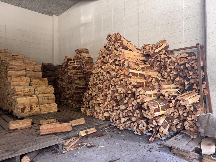 第二弾、薪の配達に追われています 2025.10.19 ここは市のとある施設。ここは1束ずつ束ねる必要があり、PPバンドで結束させていただいています。トラックに満車200束納品させていただきました。この薪はこの施設で使うBBQやはんごう炊飯のための薪。火付きがいいように杉檜の混合で薪ストーブ用より細く割っています。