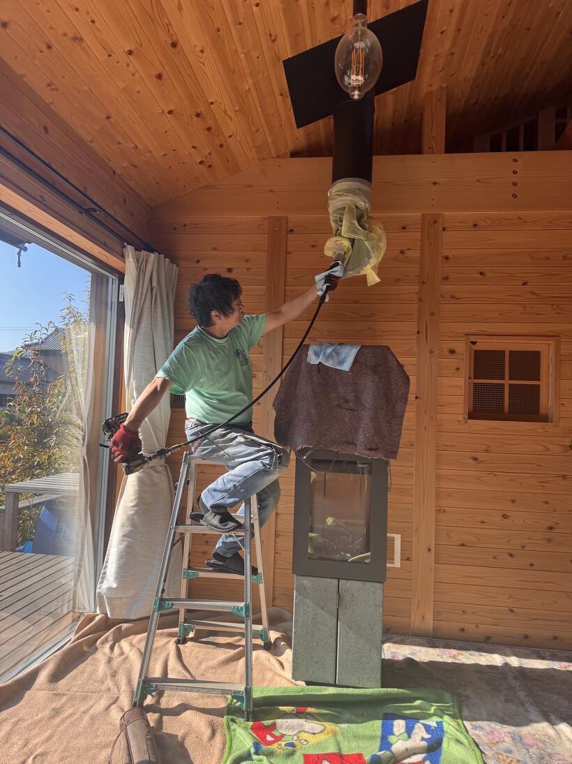 いつも通りストーブ口元の煙突を外して掃除させて頂いております。雨が降っていてもこの方法なら掃除ができます。