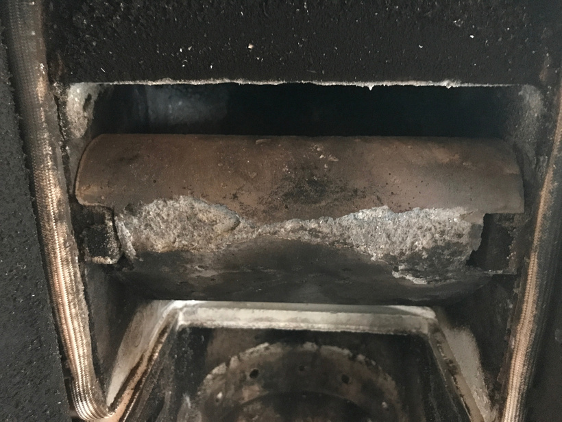 写真で色が少し変わっている箇所が確認できると思いますが、オーバーヒートで蓄熱体の表面耐火度が超え剥がれ落ちてしまっています。原因は薪の投入過多。蓄熱ストーブは一般的な連続運転を必要とするストーブと違い、一回の燃焼でストーブが高温状態になり長時間に渡り放熱します。追加の薪の投入の意味は、最高温度に達した蓄熱体をキープさせることが目的です。投入量は2本まで。それ以上入れると更に蓄熱量が増し、耐火度を越してしまいます。耐火度は1250℃以上あります。この様なオーバーヒートは鋳物のストーブから買い替えられたお客様に多く見られます。鋳物ストーブから買い替えられたお客様には薪を投入しない勇気がいるのかもしれません。